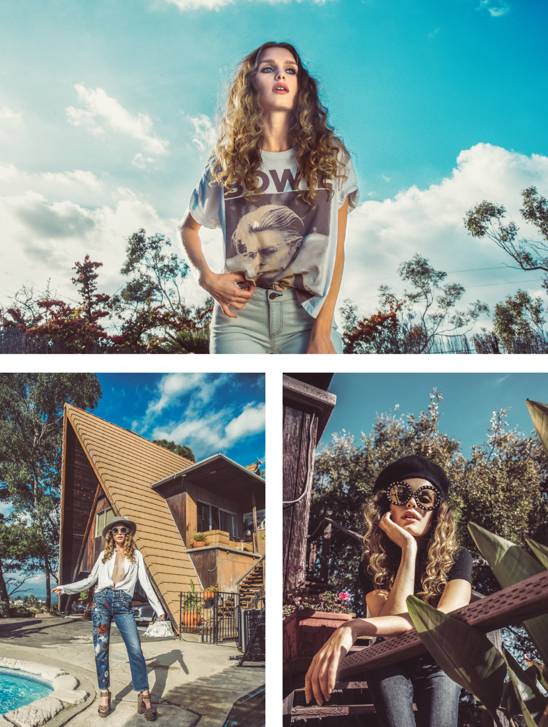This brand new denim line launch channels the sun-drenched spirit of Los Angeles with a nostalgic nod to vintage rock culture. Featuring effortless denim and a graphic Bowie tee, the look captures the raw energy of 1970s rebellion with a modern, feminine edge. The setting—bathed in golden light and framed by desert flora—amplifies the laid-back cool and iconic attitude at the heart of the collection.
