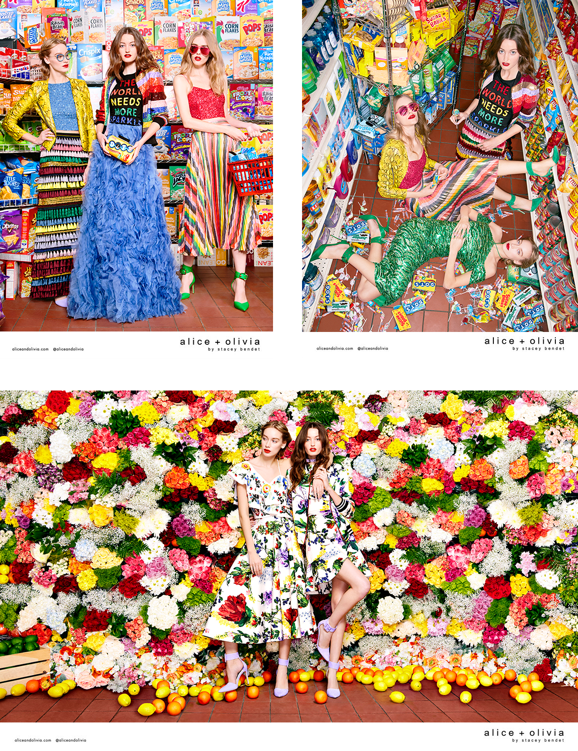 This Alice + Olivia campaign bursts with vibrant energy, evoking the height of springtime glamour. Dressed in bold, painterly floral prints with voluminous silhouettes, the styling strikes a balance between playful femininity and sophisticated drama. The scattered deli backdrop adds a whimsical, unexpected touch that enhances the overall freshness and exuberance of the scene.